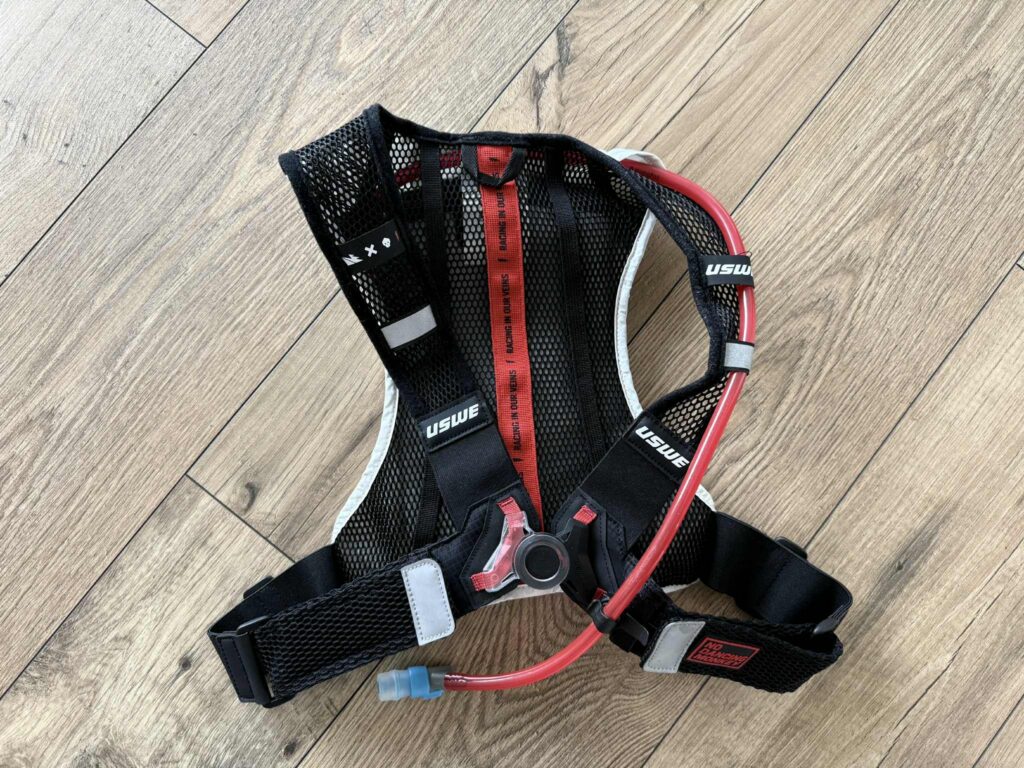 Ook de manier waarop je de riemen van deze USWE-rugzak aan elkaar vastklikt op je borst, kan me bekoren. Door de grote ronde kliksluiting vormen de lichte riemen van mesh stof een kruis over je borst. De onderste twee riemen zijn deels elastisch en kan je met brede velcro straps makkelijk instellen. Dat idee noemt USWE zelf hun ‘No dancing monkey’-technologie. Het zorgt ervoor dat het rugzakje altijd stevig op je rug vasthangt en niet als een dansende aap op en neer wipt bij elke schokbeweging. Voornamelijk trail runners en hardlopers zullen dat productkenmerk kunnen appreciëren, maar ook op de fiets vind ik de gekruiste vorm van de riemen aangenaam omdat ze zo een stuk minder irriteren aan de oksels.