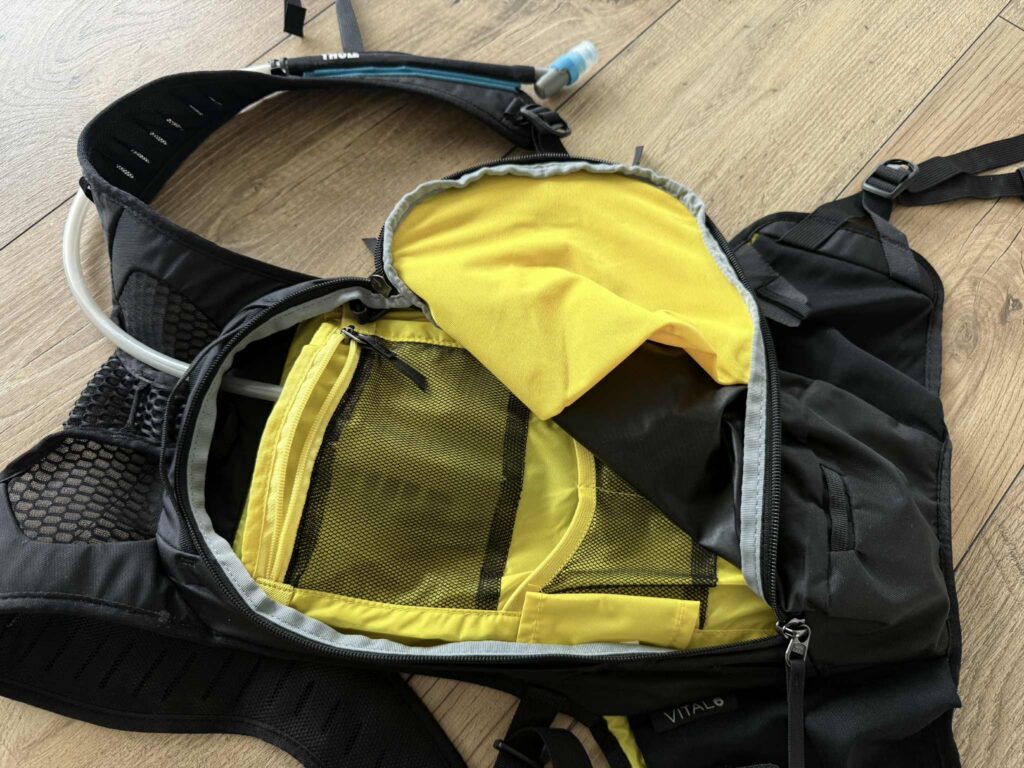 Binnenin heeft de Vital 6L verschillende kleine opbergvakjes en ook langszij zijn er twee mesh vakjes waar je bij kan terwijl je fietst en waar je dus iets om te eten in kan wegstoppen. Toch is het een makkelijker om proviand in zakjes aan de schouderriemen te steken omdat je het daar veel makkelijker uithaalt tijdens het fietsen. Bij deze rugzak moet je een eind naar achteren grijpen en zie je dus ook niet wat je precies aan het doen bent.