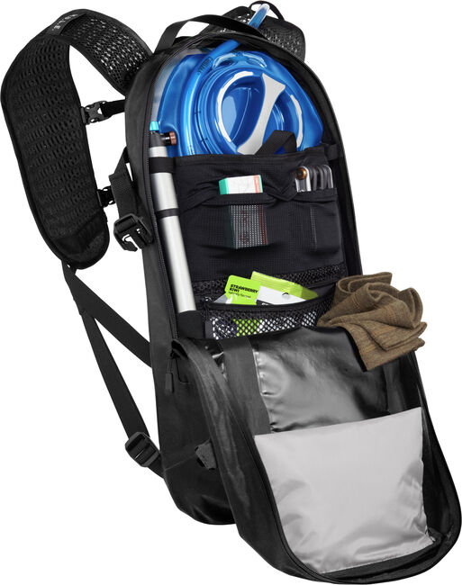 Hydrapak lijkt voor de meeste rugzakfabrikanten het geliefkoosd waterreservoir en ook bij EVOC doen ze er een beroep op. Je plooit de bovenste rand van de ‘bladder’ rond een kunststof stokje en schuift daar een kunststof houder overheen om het geheel waterdicht te maken. Het mondstuk kan je makkelijk uit elkaar halen en na afloop van je tocht uitspoelen. Dat is een must, ook al drink je uitsluitend water en geen sportdrank. Onder het rubber ontstaat immers in een mum van tijd een broeihaard van bacteriën.