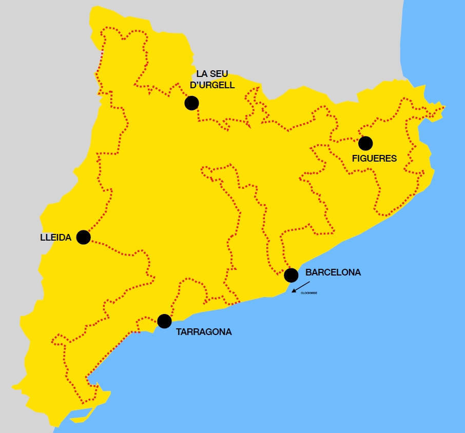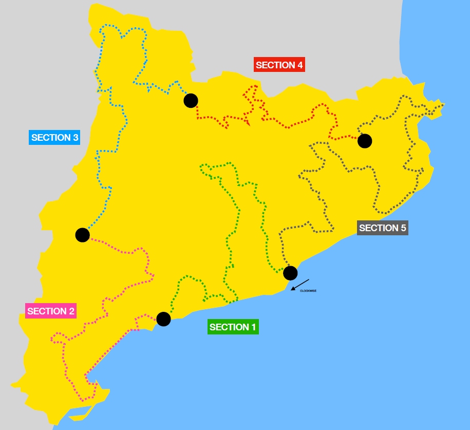 De eerste sectie leidt van Barcelona naar Tarragona. Over een afstand van 481 km worden 8.454 hoogtemeters verzamelt. Daarna gaat het van Tarragona naar Lleida voor sectie 2, die 460 km en 6.092 hm telt. Sectie 3 leidt je van daaruit over 491 km naar La Seu d’Urgell. Deze sectie kent de meeste hoogtemeters: 11.390. Na het afleggen van sectie 4 – 404 km en 8.398 hm – belandt je in Figueres voor de laatste sectie met finale aankomst terug op startplaats Barcelona. Die laatste reist 652 km langs de Spaanse Oostkust en hinterland, en biedt zo 10.781 hoogtemeters.