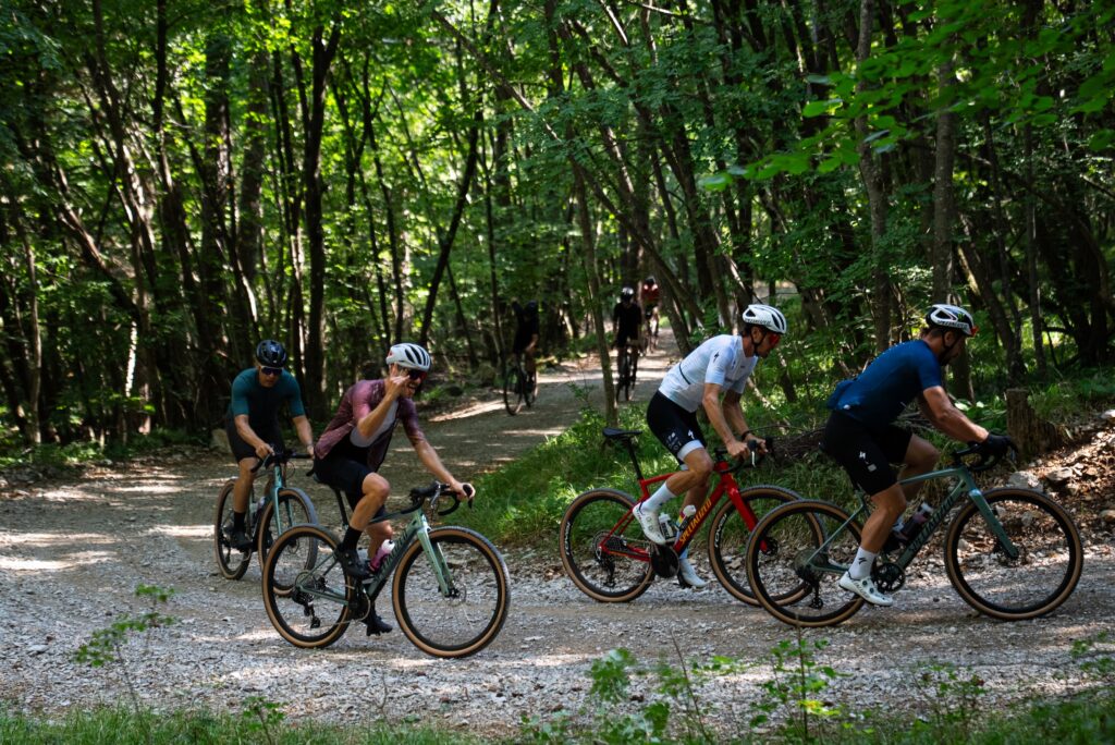 Parcoursen worden op perskampen vaak zo uitgestippeld dat ze de capaciteiten van een fiets extra in de verf zetten. Dat is ook nu het geval. We fietsen in Slovenië heus niet altijd over champagnegravel, integendeel. De routebouwer van dienst heeft zijn best gedaan om ook wat singletracks en rotsachtige paadjes te zoeken in de Mediterraanse bossen. Als de top tien van enkele Strava-segmenten in de buurt ingepalmd wordt door mensen van de groepsrit, dan weet je dat je in een soort onontgonnen gravelgebied bent terechtgekomen. ‘To boldly go where no gravelbikers has gone before.’ Dat was de bedoeling van Specialized. Missie geslaagd! En ik stel er tot mijn groot plezier vast dat de fiets ondanks zijn stabiliteit geen saai rijgedrag heeft. Integendeel. Dit is geen trein die alleen maar vooruit wil. Het stuurgedrag is netjes in balans en de combinatie met het 40 cm brede stuur werkt wat mij betreft heel goed. De Diverge 4 is een fiets die je meteen in de vingers hebt en dat maakt het leuk. Al in de eerste hectometers van het perskamp heb ik er geen problemen mee om vol gas van offroad hellingen naar beneden te denderen. En ook de collega’s rondom mij kunnen meteen met de fiets overweg.