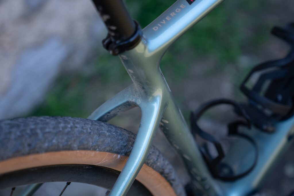 Had de Diverge die facelift dan wel echt nodig? Dat hangt ervan af hoe je het bekijkt. De fiets is intussen al meer dan vijf jaar op de markt en in die tijd is het gravelgebeuren tot volle ontplooiing gekomen. Naast de ‘gewone’ Diverge lanceerde Specialized enkele jaren geleden nog de opvallende en extra capabele Diverge STR met Future Shock-demping zowel in de stuurpen als ter hoogte van de zitbuis. Vooral de toevoeging van die ‘achterdemper’ verdeelde de meningen en ook ik vond de meerwaarde beperkt. Bovendien is de grote complexiteit van het systeem voor mij een afknapper. Naar comfort toe is het veel eenvoudiger om gewoon een goeie, flexibele carbon zadelpen te monteren en meer ruimte in het frame te voorzien voor bredere banden. Laat dat nu net hetgeen zijn waarin de Diverge 4 verschilt van zijn voorganger. De nieuwe Roval Terra zadelpen in de Diverge 4 biedt volgens Specialized 18 mm flex en de ‘tyre clearance’ in de voor- en achtervork werd opgetrokken van 47 naar 50 millimeter. Al maakt Specialized zich sterk dat ook mountainbikebanden van 2,2 inch in het frame passen.